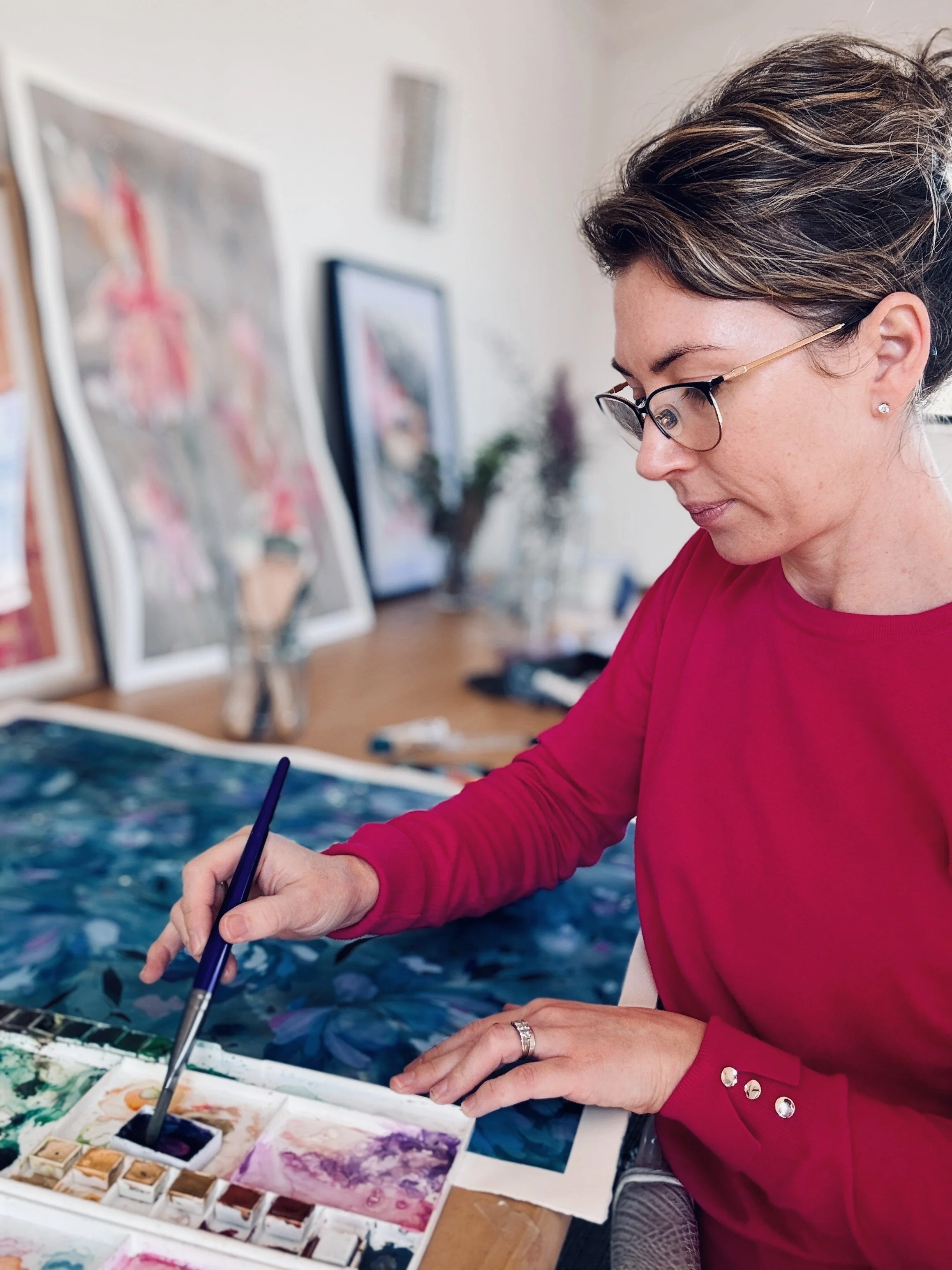 Today, from my sunlit studio my focus is creating custom art pieces and high-quality prints, Whether you're looking for artwork that is not only tailored to your home but connects you to your space, or prints that capture the essence of my original work, I am dedicated to adding a unique, personal touch and making your walls bloom with personality!